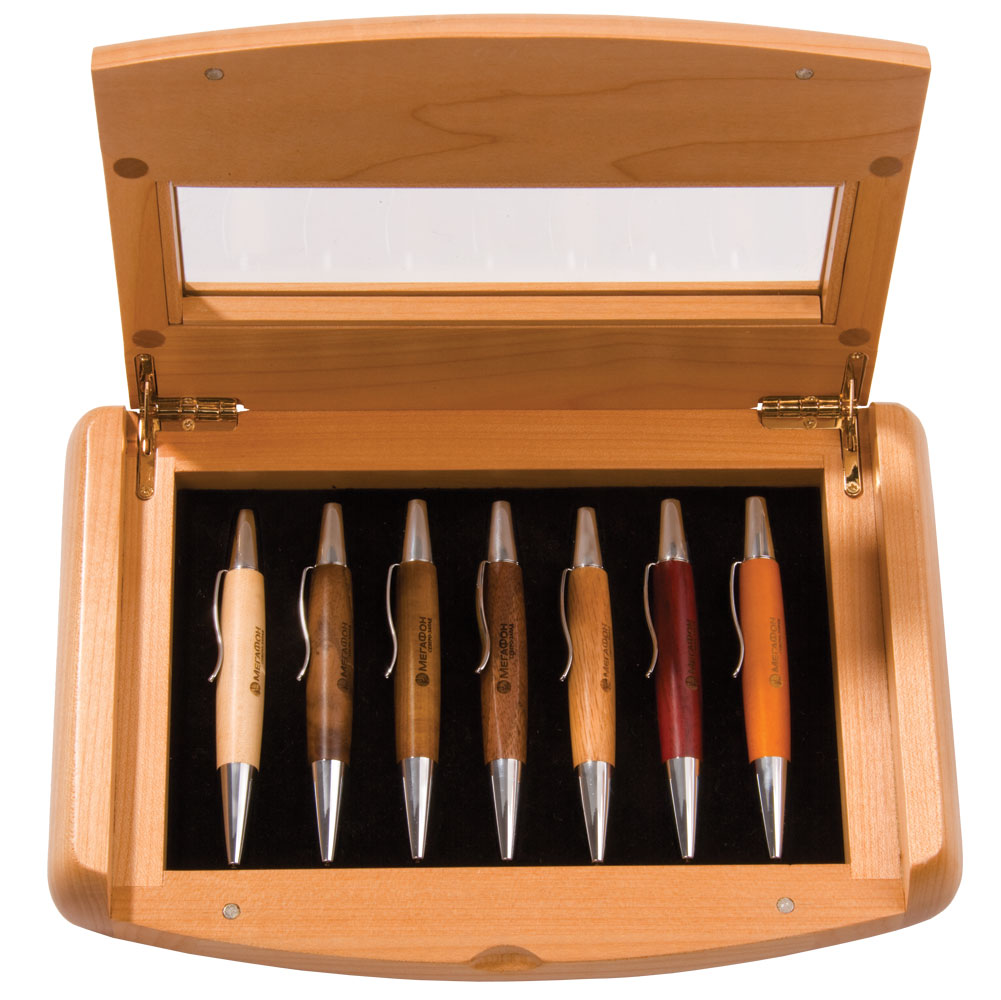 В наборе 7 шариковых авторучек. Стержни с синими чернилами.